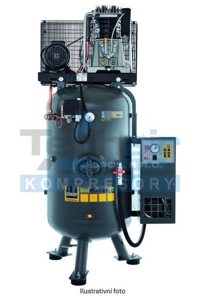 Pístové kompresory UniMaster jsou silné a robustní a jsou optimálním řešením, když nepotřebujete vzduch trvale - např. v malém autoservisu. Stacionární kompresor UniMaster STS je vybaven integrovanou kondenzační sušičkou, která zajišťuje optimální pracovní výsledky díky dodávce kvalitního, vysušeného stlačeného vzduchu. Díky svislému provedení šetří místo a konstrukce je navržena pro snadnou obsluhu i dlouhou životnost. Dvoustupňový 2válcový pístový kompresor s pohonem klínovým řemenem poskytuje spolehlivý výkon. Vzdušník je vyroben podle normy AD2000 a chráněn proti prorezavění – se zárukou 15 let. Stabilitu zajišťují silentbloky, nechybí mezichladič a dochlazovač.